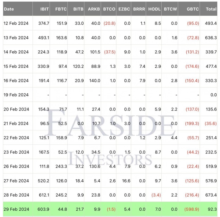Перед тем как вы погрузитесь в изучение статьи, обратите внимание на тот факт что всё упомянутое в ней не является финансовой рекомендацией для принятие более взвешенного решения просьба провести свое собственное исследование. ________________________________________________________________________ Наблюдаем сильный положительный чистый приток средств в BTC ETF за последние несколько дней, теперь, когда продажи в GBTC пошли на убыль. Это то, что поддерживало цену BTC и может продолжать повышать ее, если сильные потоки продолжатся. BTC никогда не достигал новый ATH до халвинга BTC, поэтому, если это произойдет, мы окажемся в новой парадигме, и это связано с эффектом ETF. Владельцы акций Grayscale оценили массовый памп биткоина на неделе и решили воспользоваться ситуацией - текущий отток стал рекордным, и даже не смотря на него - BTC продолжил торговаться выше $60K. Смягчило ситуацию покупка инвесторами акций Blackrock на большую сумму - $603.9М. _________________________________________