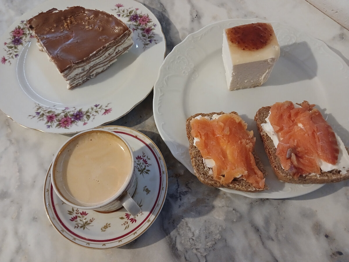 О моих запасах продуктов и бюджете на питание в марте можно почитать ЗДЕСЬ Каталог рецептов Завтракаем дома и потом уезжаем во Владимир на два дня. На завтрак сделала бутерброды (копченый голец+творожный сыр), творожная запеканка с клубничным джемом и блинный торт с шоколадом (Вкусвилл) тортик очень вкусный, воздушный крем и хороший шоколад Обедали мы уже во Владимире: в отеле в стоимость входит суп на обед. В этот день были щи. И насколько я не люблю первые блюда есть где-то, кроме дома, щи были вкусные. Щи с курицей, к ним - хлеб и сухарики Также круглосуточно бесплатно чай (был в ассортименте от обычного черного до травяного) и кофе из кофемашины. Я брала капучино, муж пил черный чай. А "к чаю" мы брали с собой из дома - сушеное манго, жареный арахис, шоколадку Ужинать муж меня повел в грузинский ресторан. Заранее забронировал столик. Он себе брал пиво, у меня - бокал вина (Саперави). Хачапури в трех вариантах - аджарские обычные и с беконом мегрули И для меня еще хинкали с ба
