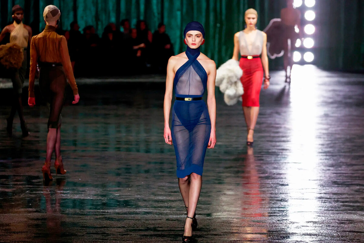 Учитывая, что запросы в Google по слову «прозрачный» увеличиваются почти каждый раз, когда какая-нибудь знаменитость надевает «голое» платье, не стоит удивляться, что одноимённая выставка, проходящая сейчас в парижском музее Ива Сен-Лорана, демонстрирует рекордную посещаемость. С момента открытия выставки 2 февраля её увидели уже более 14 000 человек, причём почти каждый день посещаемость была максимальной, что подчёркивает живой интерес к новаторской работе легендарного кутюрье с полупрозрачным текстилем и к тренду, который никак не хочет умирать. Во вторник вечером креативный директор Saint Laurent Энтони Ваккарелло создал почти всю свою осеннюю коллекцию из хрупких шёлковых чулочных тканей, которые, по его словам, стали настоящим кошмаром для ателье. «Я хотел сделать что-то очень хрупкое», — сказал дизайнер за кулисами, опасаясь, что его платья-чулки, блузки и юбки могут не выдержать даже одного выхода модели в огромном зале, пол которого напоминал мокрый асфальт, а стены были обвеш