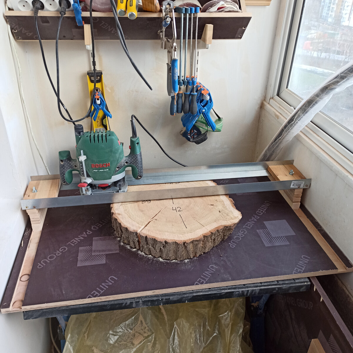 Всем привет! Сегодня хочу рассказать о наспех сделанной каретке для фрезера, предназначенной для выравнивания заготовок из дерева – слэбов, спилов. Такую каретку можно сделать быстро и просто с минимумом материалов (за исключением листа ламинированной фанеры, но он не обязателен, подойдет и обычная фанера). Фанера, по сути, жертвенная, так как прямо к ней я креплю «сухари» – маленькие плашечки, предназначенные для зажима заготовки. Основание фанеры ровное и, если сама заготовка кривая (а чаще всего это именно так), – подкладываю тоненькие деревяшки-клинышки до достижения ровной плоскости (проверяю уровнем). Дополнительно еще кладу под заготовку противоскользящую подложку для ковров (купил в Леруа Мерлен). Сама каретка состоит из двух металлических уголков. Расстояние между ними четко равно ширине подошвы моего фрезера – я использую Bosch 1400. К каретке крепятся одинаковые по толщине кусочки, нарезанные из 9 мм фанеры. Я их ставлю друг на друга, поднимая, по сути, каретку над столешниц