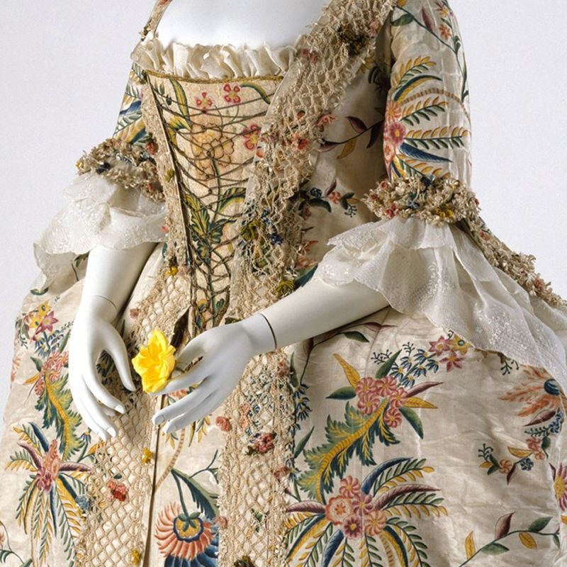 В 1740-ых гг вырабатывается английский стиль: узоры для платьев со скромными бутонами на светлом фоне и цвет