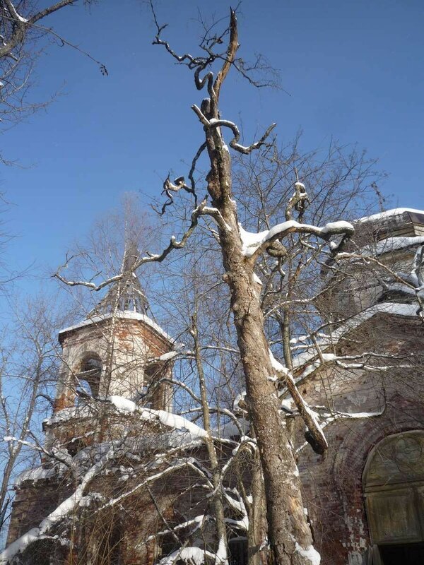 Только каменная Знаменская церковь сейчас напоминает о том, что когда-то тут жили люди. Да и та стыдливо прячется среди деревьев, не сразу её и заметишь.