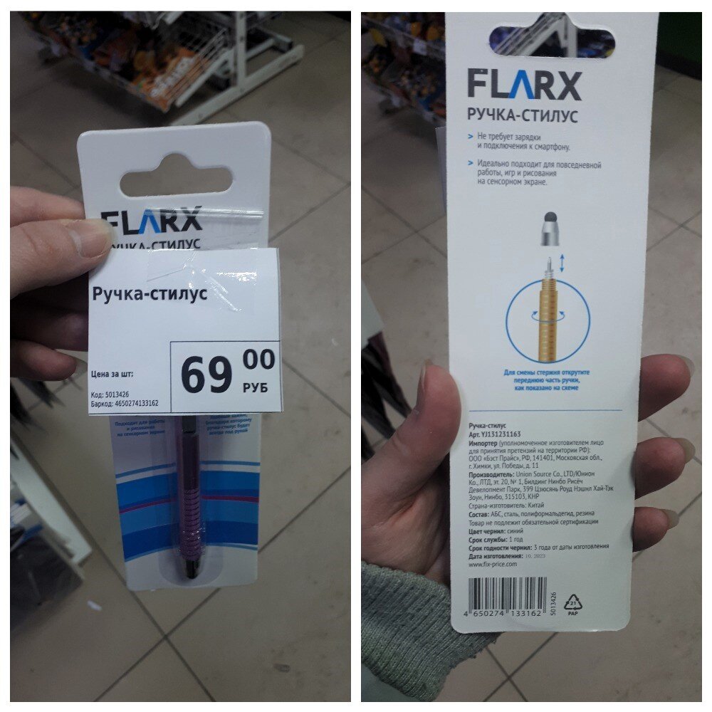 Ручка-стилус стоимостью 69 рублей. Состав: АБС, сталь, полиформальдегид, резина. Страна изготовления Китай.