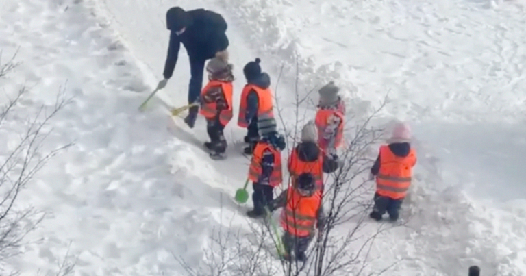 Шутки о том, что городские коммунальные службы не справляются с уборкой снега, не утихают всю зиму. Сегодня в городе заметили детей в ярких оранжевых жилетах, которые лопатками дружно стучат по снегу.