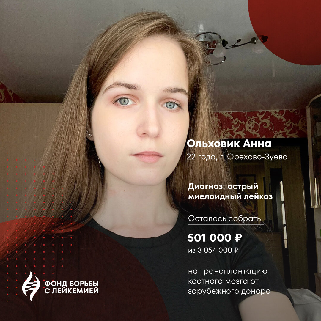 До весны 2023 жизнь 22-летней Ани была наполнена планами на будущее: она мечтала объездить весь мир, развивать карьеру в IT, проводить время с любимыми подругами. Но жизнь резко изменилась. Диагноз острый миелоидный лейкоз стал для девушки потрясением. Первая мысль: «Как же я всех подвела!» Анна настоящий борец за свое будущее. Сейчас она прошла шесть курсов химиотерапии и настроена позитивно — уже после первого курса удалось выйти в ремиссию. Впереди девушку ждет трансплантация костного мозга от зарубежного донора, который уже найден. Требуется лишь оплатить обследование донора, заготовку и перевозку трансплантата. Анна говорит, что диагноз во многом изменил ее мировосприятие. Пришло понимание, что нужно жить здесь и сейчас, не откладывать планы на потом, прислушиваться к себе и не «загоняться по мелочам». Анна верит, что победит болезнь, вернется к работе, съездит с подругой в Питер, а еще обязательно побывает на море. Поверьте в Анну и вы. Помогите ей скорее закрыть сбор, достаточно
