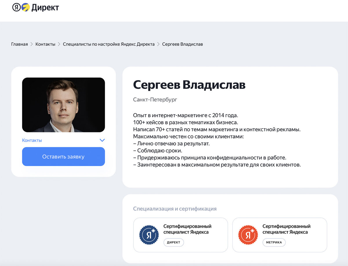 29 февраля 2024 года Яндекс добавил меня в список рекомендованных специалистов Яндекс.Директ. Мой профиль выглядит вот так: В этой статье хочу поделиться тем, как попал в этот самый список и для каких целей я вообще решил это сделать. Как я попал в список рекомендованных специалистов по Яндекс.Директ Алгоритм на самом деле не такой уж и сложный, для этого нужно: Про алгоритм поговорили, с какими сложностями я столкнулся по факту: Самым непростым для меня стало прохождение сертификации. Признаюсь, до этого у меня уже было несколько попыток прохождения сертификации и все они были неудачными. При всем моем практическом опыте – не хватало знания каких-то теоретических нюансов, из-за которых из раза в раз проваливал тест. В феврале 2024 года, уже поднабив массу шишек на вопросах из теста, я прошел сертификацию без проблем и набрал более 95% правильных ответов. Помимо сертификации на продвинутый уровень Яндекс.Директ – я прошел тесты по Яндекс.Метрике, рекламе мобильных приложений и медийной