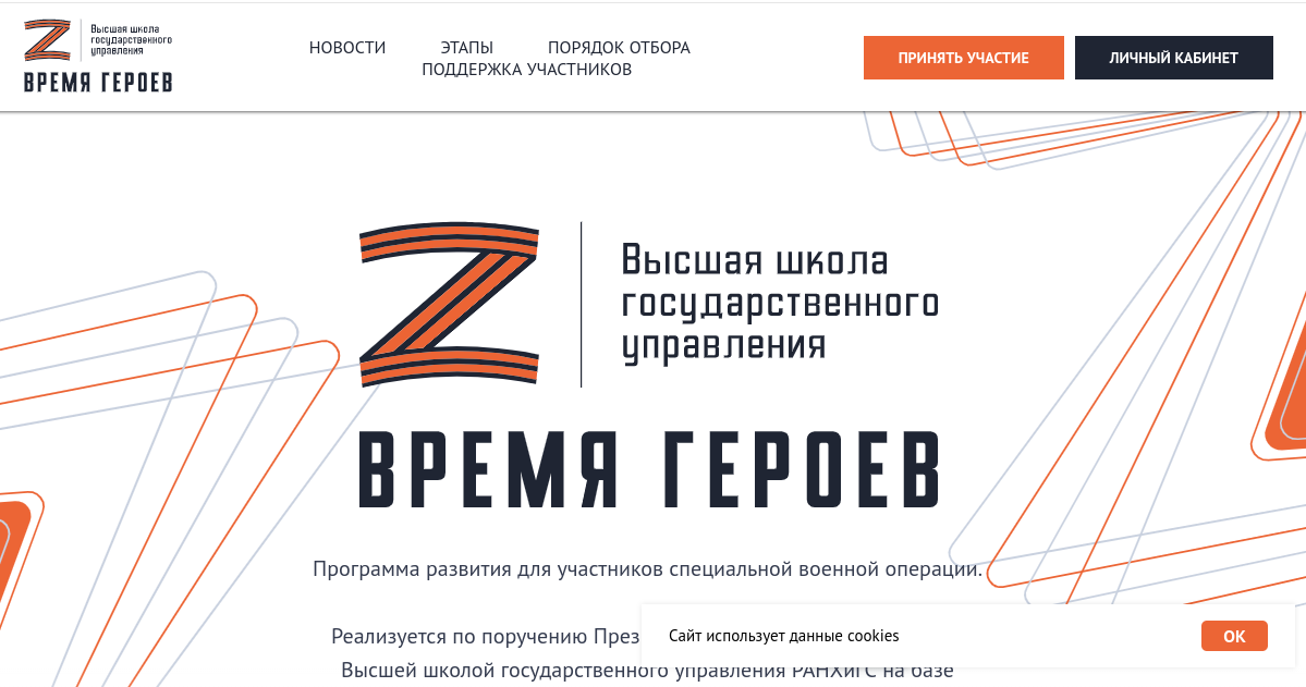 18:00, 1 марта 2024 года. Как и было объявлено накануне, заработал сайт "времягероев.рф". Уже можно подать заявку. Там требуется заполнить анкету и написать эссе. К анкете (для тех, кто сейчас уже на "гражданке") нужно приложить скан разворота паспорта, диплома и свою фотографию, сделанную не ранее последних 6 месяцев. После того, как заявки будут одобрены, участники пройдут онлайн-тестирование (в апреле). А затем получат возможность обучения на платформе РАНХиГС (Российской академии народного хозяйства и государственной службы). Прошедшие конкурсный отбор получат персональное наставничество со стороны руководителей администрации президента РФ, членов правительства, губернаторов областей, мэров городов, директоров ведущих российских компаний. Что за эссе требуется написать? В эссе нужно будет ответить на три вопроса: Кто может подать заявку? Собственно, об этом президент сказал ещё вчера, в Послании к Федеральному собранию: Песков сегодня повторил критерии отбора. Для того, чтобы