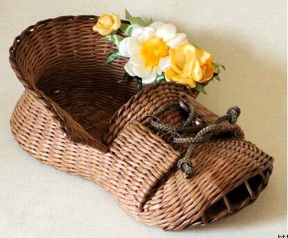 Для плетения я использовала трубочки, скрученные из газетных полосок размером 11 х 28 см и окрашенные морилкой «Дуб». На весь башмак ушло 400 трубочек. Размер готового башмака 40 см. Трубочки перед плетением я увлажняла. В этой части я расскажу о том, как плести верхнюю часть башмака. Третья часть видео про плетение башмака-корзинки из газетных трубочек рассказывает о необычной тонировке с переходом, покраске лаком и украшении цветами. Необходимые материалы и инструменты: • Газетные трубочки