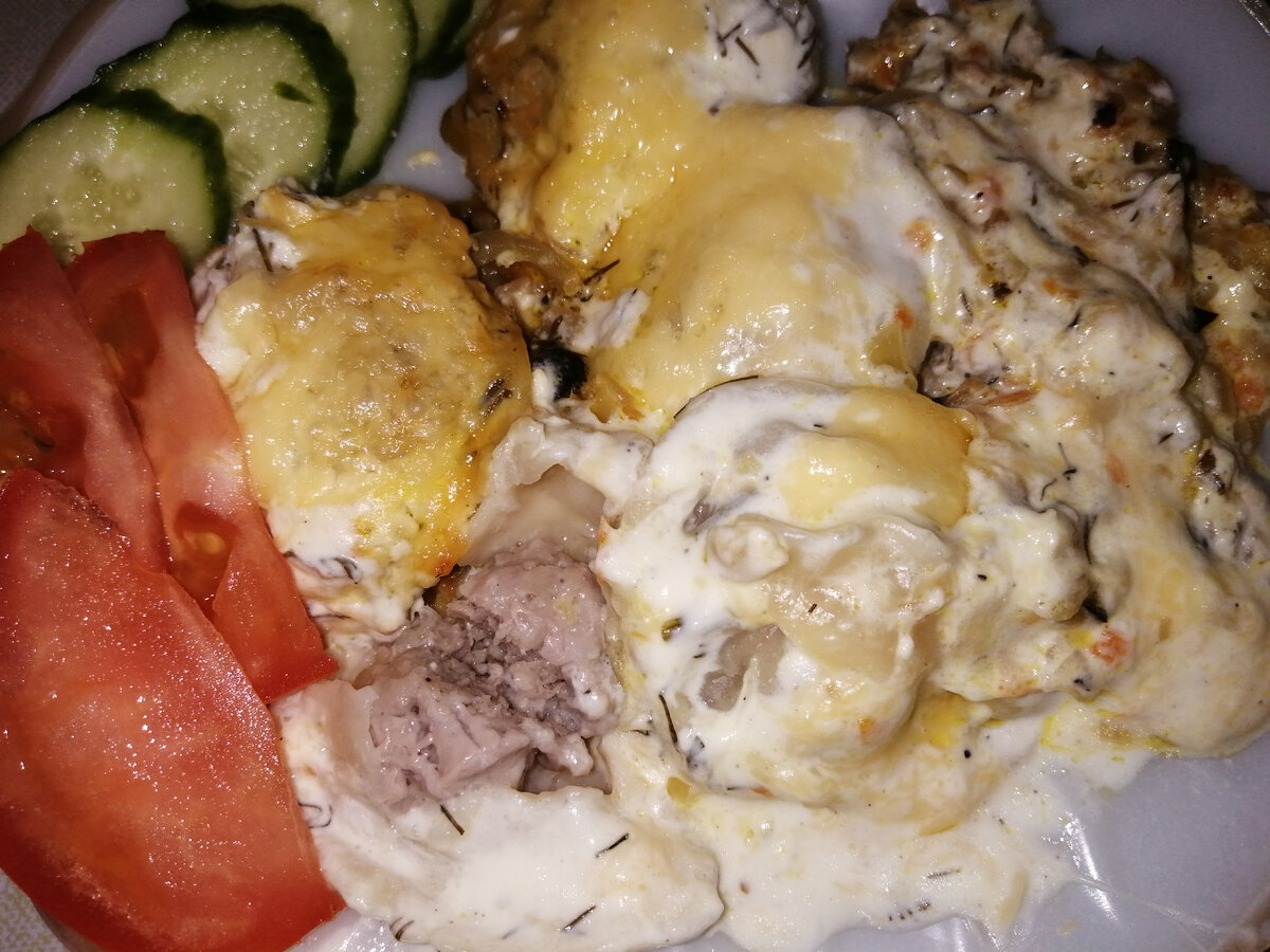 Запеканка из пельменей в сметанном соусе с грибами. Быстрое и вкусное блюдо. Без предварительного отваривания пельменей.