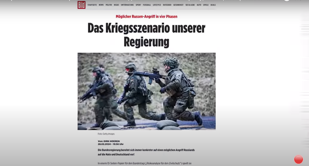 Немецкое издание Bild в среду, не дождавшись Послания Владимира Путина к Федеральному собранию, опубликовало возможный сценарий нападения России на Европу, т.е. на НАТО. Газета опубликовала выдержки из официального документа, который был представлен на рассмотрение парламента. Все начнется, по версии составителей этого бесценного формуляра с массовой "дезинформации" европейцев, при этом операция будет носить скрытый характер. Россия устроит в Европе хаос: кибератаки и нападения на объекты инфраструктуры. Это будет первая фаза. Далее, во время второй фазы, российские войска начнут массовые учения у границ НАТО. Во время этих учений Россия выведет из строя космические спутники НАТО. Далее, российские войска открыто нападут на химические предприятия и атомные реакторы в Германии. Далее наступает третья фаза, при которой Россия открыто нападает на страны НАТО. И все это время точечные удары будут наноситься по территории Германии. Четвертая фаза, по версии Bild, это прямое столкновение ст