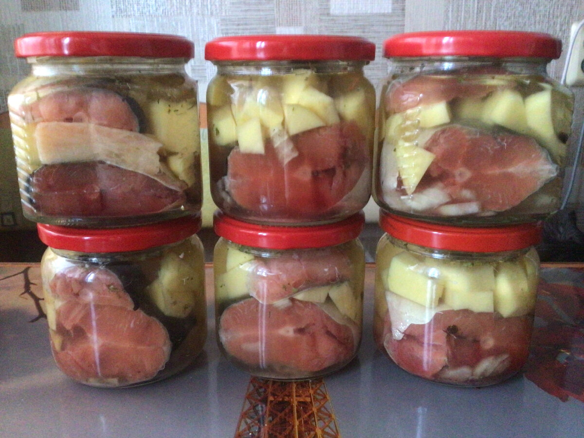 Для ухи беру банки обьемом 0.35 мл. Для меня это одна порция. В банку закладываю небольшой кусочек лаврового листа, 3 шт. чёрного перца горошком, не много нарезанного 🧅 лука, 2 - 3 кусочка любой рыбки 🐟всё зависит от вашего вкуса и желания и картофель нарезанный кубиками закладываю до плечиков банки, добавляю обязательно небольшое количество укропа, можно свежий или сухой для вкуса и аромата. В банку на объём 0,35 мл добавляю 1,7 гр. соли. Наливаю воду , не доливая до края 1 см. Плотно закрываю крышкой и ставлю в автоклав. Так как мой автоклав работает на пару добавляю 4 литра воды и плотно закрываю. Автоклавирование происходит при температуре 115 градусов 40 мин. когда температура в автоклаве опустится можно доставать банки. Уха получается очень вкусная и очень удобная в применении. Беру с собой на дачу, на работу отлично выручает. Я закладывала в автоклав уху двух видов 1) с горбушей и брюшками сёмги и 2) со скумбрией.