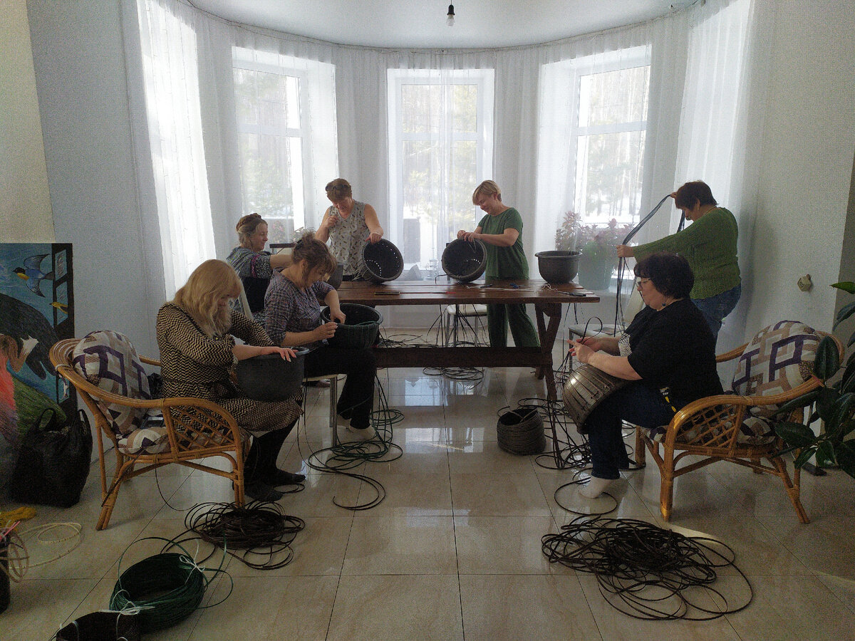 Вчера был очень насыщенный день. В деревню я приехала пораньше, по свежевыпавшему снегу. С утра у нас планировался второй сбор Женского клуба, темой которого был мастер-класс по плетению из искусственного ротанга. Встретились, как всегда, в доме у Натальи, нашей деревенской вдохновительницы и организатора. Сначала попили чаю, а потом Наташа стала показывать и рассказывать, а мы начали плести. Заготовки - просверленные 14-литровые кашпо - Наташин муж сделал заранее. Наташа показала как резать ротанг, мы выбрали себе цвет и понеслось! Я суть ухватила быстро и закончила первую часть пока другие ещё доделывали. Поэтому мы с Наташей пошли смотреть её прекрасный (хоть ещё и не полностью оборудованный дом). Вот, в такие моменты, у меня и возникает сомнение - правильно ли я поступила, купив свой домишко). Вернувшись, сделали паузу с распиванием чая, кофе и домашнего вина, принесённого одной из участниц. Ну а потом приступили ко второй части работ. Она уже не требовала такой сосредоточенности,