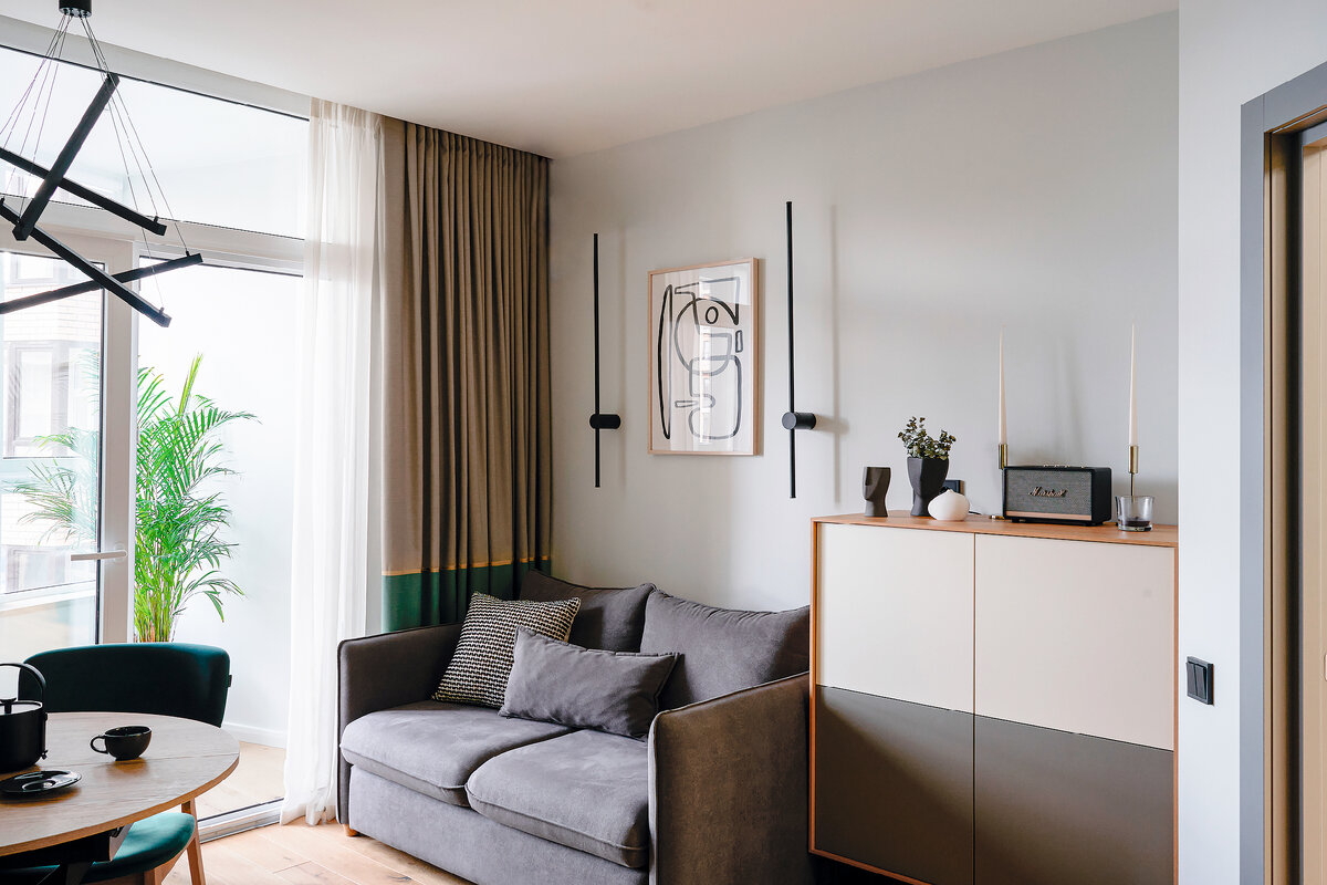 В основе концепции проекта лежало создание светлого интерьера, который будет актуален многие годы. Теплые оттенки и натуральные материалы, поселившиеся в интерьере, наполнили пространство свежестью и умиротворением. Заказчики проекта — мои давние знакомые. После приобретения квартиры они обратились ко мне с задачей создать функциональное, просторное и светлое пространство без лишних деталей. В первую очередь я сделала перепланировку: демонтировала стены на кухне и в санузле, в спальне установила перегородку для гардеробной. В процессе реализации проекта заказчики узнали, что ждут ребенка, поэтому необходимо было организовать детскую зону. Для этого большой балкон разделили на две части, одна из которых стала игровой для малыша. Также в квартире проживают два четвероногих друга, для которых сделали по две завертки на межкомнатных дверях с каждой стороны и алюминиевый Л-образный плинтус в прихожей — собаки не смогут его повредить или оторвать. Сложным, но интересным местом стала кухня-го