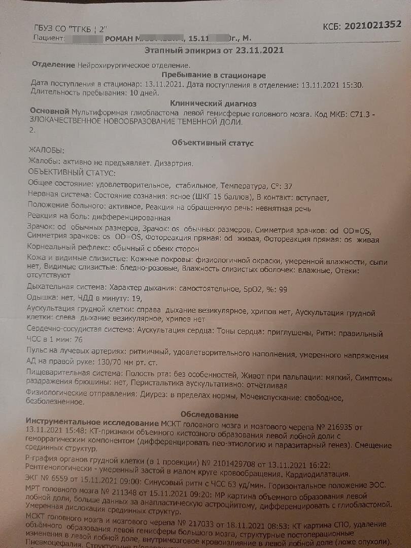 Напишу банальность, но он будто читал приговор: "Это неизлечимо.. Возможно речь уже не будет прежней... МРТ ежемесячно.. Эта операция была не последней.."