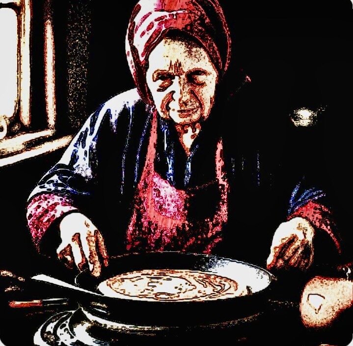 — Я ить седня блянов напякла. А эти шалды пришли и все мои бляны сожрали. Сидять, бляны жруть, в масло мачуть. А масло в-о-о-о, — взвыла бабка, — бяжить.
