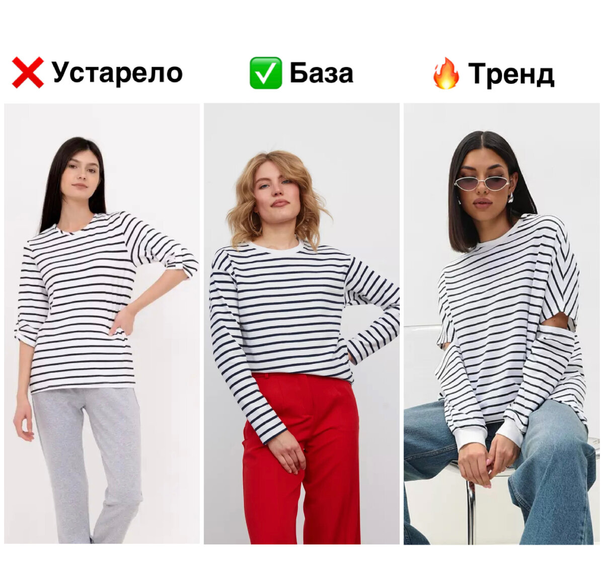 Такие подборки часто вызывают много негатива. Но мне всё равно нравится их делать :) Поймите, я не пытаюсь высмеять или обозвать некрасивой вашу любимую вещь. Моя цель — показать наглядное сравнение в изменении кроя и деталей. И в подобных подборках это видно лучше всего. Так что ничего личного, просто мода. Мои некоторые любимые вещи точно так же оказывались в неактуальных, а лет через 10 ещё много отправится в «устарело». Моду устанавливают мировые бренды, знаменитые дизайнеры, инфлюенсеры, общие мировые тенденции и др — это данность, которую не поменять. Но как бы то ни было, если следовать моде осознанно, если расширять модные границы и пробовать что-то новенькое — в этом есть большие плюсы. И ещё: в «✅ база 🔥 тренд» я показываю только ОДИН ИЗ возможных вариантов (их всегда несколько). 🔵 Пример №1 ❌ Свободный, но приталенный фасон вместе с укороченным рукавом устарел. Если вам нужно облегание — выбираем полностью узкое изделие (похожее на водолазку). ✅ К базе можно отнести