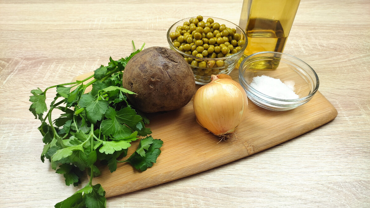 Простой в приготовлении и невероятно вкусный постный салат из свеклы, зеленого горошка и зелени – настоящая находка для любой хозяйки. Легкий на вкус, свежий и сытный салат станет украшением любого стола. А на приготовление нужно всего 10 минут. Обязательно приготовьте и порадуйте себя и своих домашних вкусным и полезным блюдом! А вы знаете, что в свекле содержится пигмент беталаин? Он является сильным антиоксидантов. Беталаин помогает бороться со свободными радикалами и замедляет все воспалительные процессы в организме и помогает снизить уровень холестерина в крови. Ингредиенты: Свекла 1 шт. Лук репчатый 1 шт. Зеленый горошек 180 гр. Свежая петрушка 1 пучок Растительное масло для заправки Соль по вкусу Подготавливаю все продукты. Зелень мою под проточной водой и обсушиваю. Теперь требуется отварить свеклу. Можно сделать это несколькими способами. Первый способ – просто отварить в воде. Второй – запечь свеклу в духовке до готовности. Третий способ, которым я и воспол
