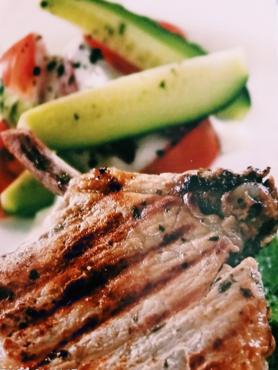 Корейка свиная с косточкой 1кг, Салат кочанный 1шт, Помидоры 6шт, Огурцы 3шт, Йогурт натуральный 200г, Зелень петрушки и сельдерея по 1 пучку, Перец Чили 1 стручок, Масло растительное 1/2 стакана, Сок лимона 1 ст. л, Перец чёрный молотый, соль. Для маринада зелень мелко порубить, добавить нарезанный кольцами чили, масло, лимонный сок, посолить, поперчить и перемешать. Корейку разрезать на порционные куски по ширине косточек, отбить и положить в маринад на 2 часа. Отбивные обжарить на гриле до готовности. Уложить отбивные на листья салата и подать с помидорами и огурцами, нарезанными дольками и заправленными йогуртом. Приятного аппетита.