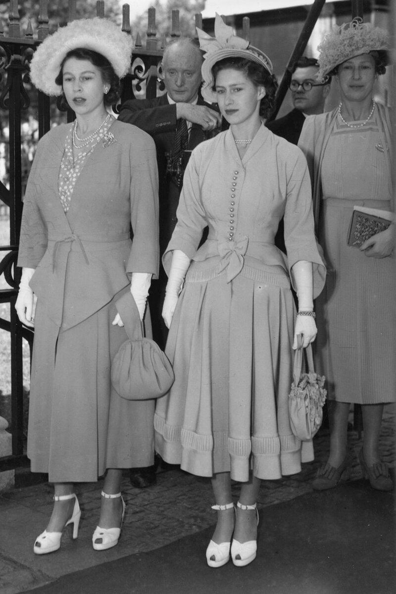 Всего год назад, в 1947 году, мсье Диор предложил восторженной публике свой "новый взгляд" и вот первые модницы своего времени уже демонстрируют новый стиль с довольно смелыми по тем временам подчеркнутой талией и широкой юбкой. А какие туфельки... Какие сумочки... 1948 год. Принцесса Елизавета и принцесса Маргарет на свадьбе лорда Дерби и леди Изабель Миллес-Лейд. Конечно, подход к формированию образов у двух сестер несколько отличается. Елизавета, как наследная принцесса, одета более строго, если не сказать архаично. На канале по теме: Такой мешковатый бабский сдержанный костюмчик с невнятной шляпкой был бы более ожидаем на даме элегантного возраста, чем на 20-летней девушке, но что поделаешь, положение обязывает. Тем не менее, присутствует стойкое ощущение, что Елизавета забрала его у своей матери. Ситуацию несколько спасают молодое личико будущей королевы и модные белые босоножки, но тем не менее. А вот принцесса Маргарет, менее скованная протоколом, а также более живая по темпе