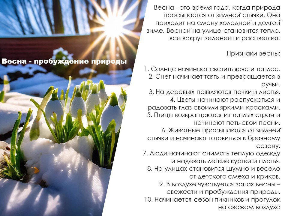 💐🌷☀️ Разговоры о весне с детьми помогут им лучше понять и запомнить, что происходит в природе в это время года, какие изменения происходят в жизни животных и растений. Это также может помочь развить у детей интерес к природе и окружающей среде, а также научить их заботиться о ней. Кроме того, такие разговоры могут помочь детям развить свою речь и расширить словарный запас.
