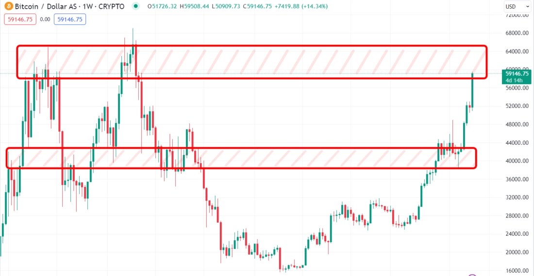 В последние два дня биткойн продемонстрировал впечатляющий рост, поднявшись выше отметки в 58 тысяч долларов и показав 11% прирост. Этот динамичный рост вызван рядом факторов, включая увеличенный интерес институциональных инвесторов, укрепление доверия к криптовалютам и общий рост интереса к цифровым активам. Однако, несмотря на этот впечатляющий рост, биткойн все еще сталкивается с последним уровнем сопротивления на отметке в 65 тысяч долларов. Пробитие этого уровня может стать ключевым моментом для дальнейшего развития цены биткойна. Многие аналитики и эксперты считают, что после преодоления уровня сопротивления на 65 тысяч долларов, биткойн может начать свой путь к новым высотам.Некоторые прогнозируют, что цена главной криптовалюты может достигнуть отметки в 120-170 тысяч долларов в ближайшем будущем. Этот потенциальный рост вызывает большой интерес у инвесторов и трейдеров, которые надеются на дальнейшее увеличение своих инвестиций. Однако, стоит помнить, что рынок криптовалют изв