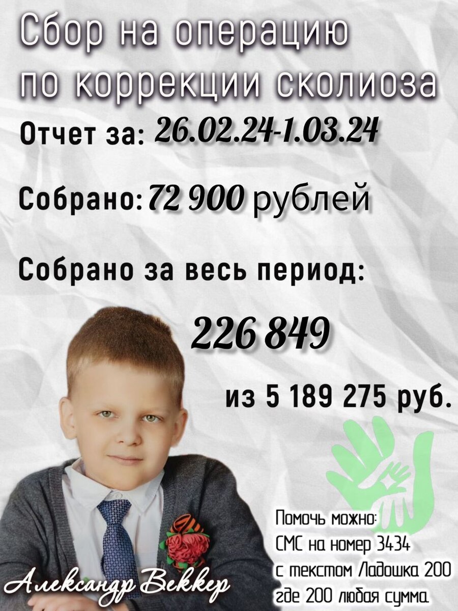 Дорогие друзья! Отчет за 26.02.24-01.03.24 по срочному сбору для Александра Веккер, которому требуется операция по коррекции сколиоза. Поступило средств: 72 900 р. Всего собрано: 226 849 р. Мы говорим всем вам огромное человеческое СПАСИБО! Желание помочь ближнему - это великий дар, который есть у человечества. Спасибо вам! Помочь Саше можно: ✅ смс Ладошка 200 на номер 3434, где 200 - любая сумма; ✅ на сайте фонда любым удобным способом. https://starforsma.ru/children/sasha-vekker ✅ Присоединиться к команде волонтеров фонда, помогающих Александру Веккеру https://t.me/obvolstarforsma ✅ Принять участие в благотворительной лотерее в наших социальных сетях @lotteryvolstarforsma #сашавеккер #срочныйсбор #звезданаладошке #волонтерызвезданаладошке
