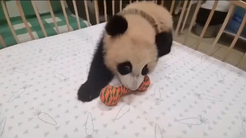 Катюша стремительно растет и весит уже 14,8 килограмма. Но все же продолжает вести себя, как маленькая — кувыркаясь, пандочка старается уползти и не забыть свою оранжево-зеленую игрушку в форме гантели.