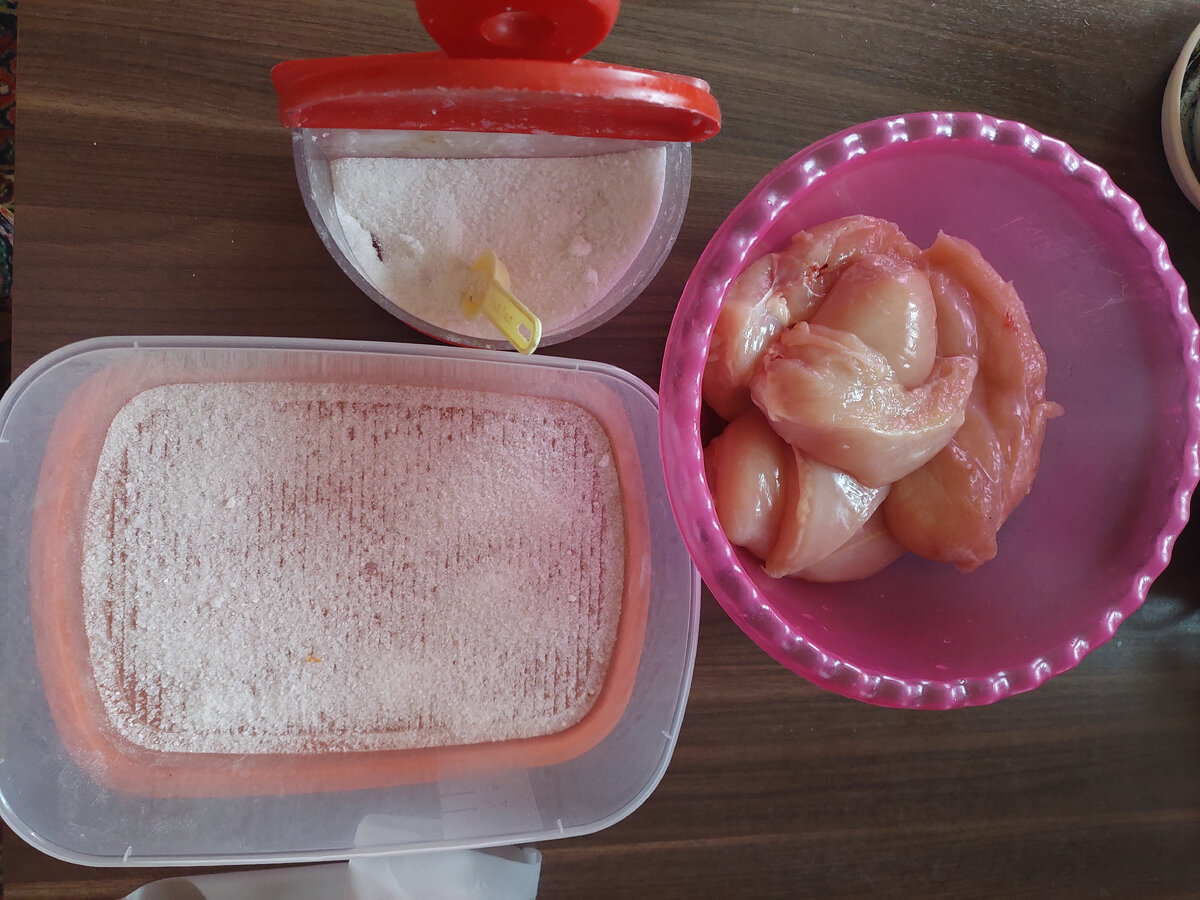 Давно меня не было!!! Неделю назад мы с мужем решили проэкспериментировать и приготовить карпаччо дома. Почитали рецепты в интернете, нашли для себя лучшие варианты. Одним из таких вариантов делюсь! Мы взяли 4 куриные грудки, соль и контейнер. На начальном этапе этого достаточно. Этап 1. Грудки тщательно промыли, обсушили полотенцем и натерли солью. Теперь берем пластиковый контейнер (лучше стекло) и насыпали на дно соль. Далее положили на соль куриные грудки и сверху тоже немного засыпали солью. Ставим гнёт и убираем на 12-18 часов в холодильник. Мы убирали на ночь. Этап 2. По истечению времени, достаём, сливаем воду с солью и замачиваем грудки на 4 часа в холодной воде. Грудки должны стать менее жёсткими (после соли). А теперь мы должны их хорошо промыть и обсушить. Этап 3. Пока грудку отложили в сторону, и приступили делать 4 смеси, которыми в процессе готовки натирали будущее карпаччо. Итак, варианты: 1) Душистый перец, паприка копчёная, чёрный перец, кориандр. 2) Паприка, чесно