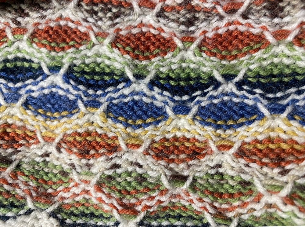 Не буду утверждать, но подозреваю, что фанговые узоры происходят от английского слова fang , что в переводе означает клык. Но если присмотреться, то действительно можно увидеть острые “клыки”, которые перетягивают полотно, создавая неожиданный узор. Для новичка, смотрящего на лицевую сторону изделия, связанного фангами, не всегда понятно, как это связано, особенно, если в узоре не таки много рядов и не видно стяжки. Например в данном случае, кажется что связано жаккардом. В данном случае фанговый узор, выполненный двумя пряжами: секционной и чисто белой. Белая пряжи создает ограничивающий контур, заполненный размытым узором. У нас образовался небольшой остаток секционной пряжи, который некуда было пристроить. Сама пряжа была слишко мрачного цвета, более годная на свитер, темновата к лицу. И мы ее делали более светлой. введя в нее белые фрагменты и украсив светлыми ячейками. Платный мк ПЕРВЫЙ СНЕГ Из интересного в шапке -это почти плоский затылок. Для большей выразительности он офор