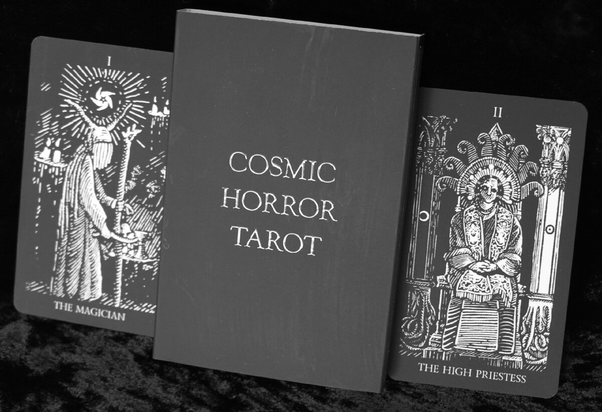 Проект Линотаро XXII (Linotarot XXII) был создан художником и издателем Даной Макаридиной, чтобы скоординировать усилия художников и тарологов, создающих новаторские колоды Таро в технике печатной графики (гравюры) или в связи с ней. Проект был запущен 22 февраля 2022 года. Дата нумерологически красивая и находится в преддверии знаменательного события, открывшего новый славный период нашей истории. Проект успешно работает уже два года, и в его рамках изданы две колоды, которые я здесь и рассматриваю. Готовятся к изданию еще две. Cosmic Horror Tarot (Таро Космического ужаса), первая колода проекта, создано художником Thy Grief в технике линогравюры. На этих картах мы не увидим гигантскую фигуру Ктулху, которого все давно узнают по щупальцам. Зато видим главную составляющую мрачного лавкрафтианского мира - затерянность человека в безбрежной космической черноте, которая служит полем игры для сил, превосходящих воображение. Как издана и оформлена колода, видно на фото. Качество карт очень