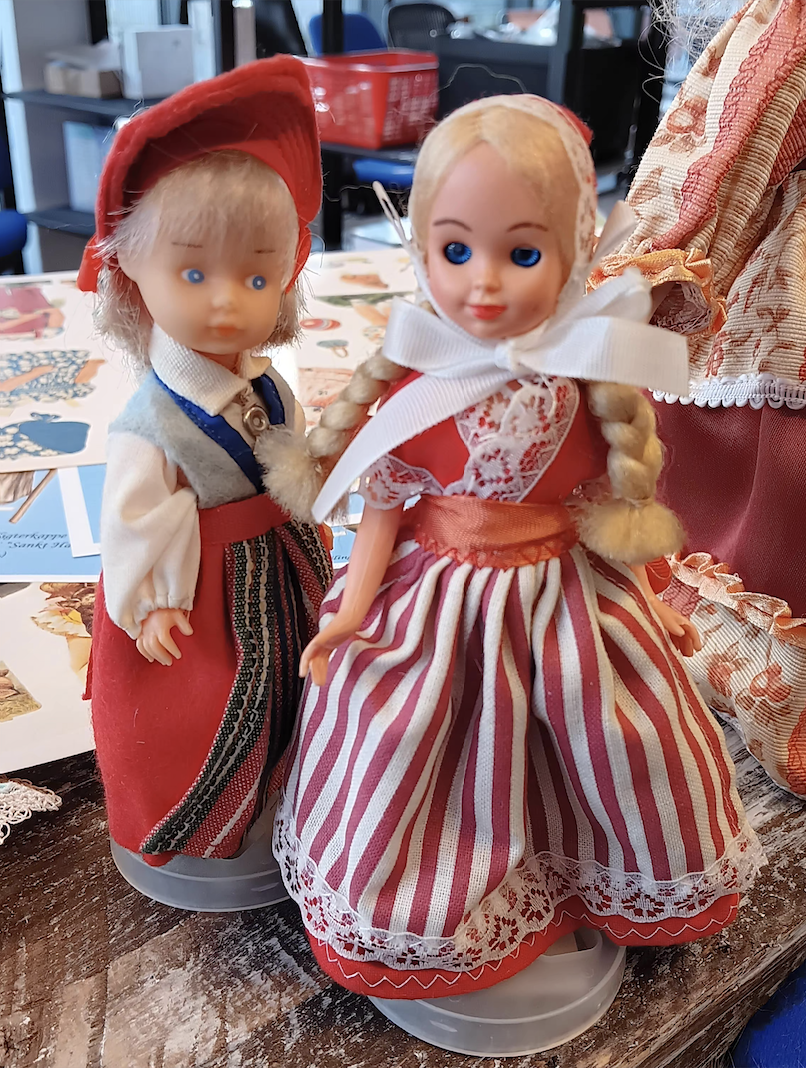 Я не уверена, что это датские национальные костюмы, но похоже на то, что я видела в музеях - и никогда на датчанах. Как-то они (датчане) не сильно интересуются своими национальтными одеяниями. Но куколок в разнообразных национальной одежде тут много:
