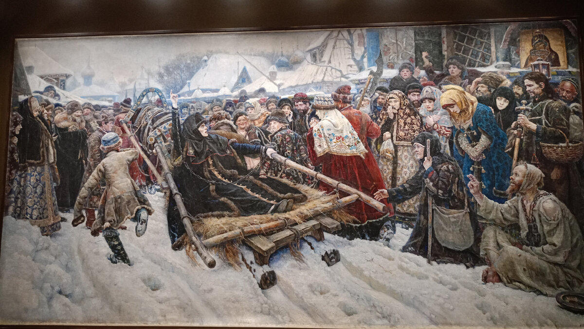 Ну конечно же картина "Боярыня Морозова". Она невероятная. От неë с трудом отрываешься, чтобы идти дальше. Ей отведëн целый зал. Там есть ещë другие картины -они связаны с "Боярыней Морозовой". В основном это этюды к ней. Каждый этюд является картиной, несмотря на небольшие размеры. Я уже писала в первой статье об этой выставке, что в этом зале провела больше всего времени. Сначала там было очень много людей. Две экскурсионные группы теснились и экскурсоводы громко рассказывали каждый своë. По хорошему мне надо было бы пройти дальше в другие залы, а потом вернуться, но я не могла оторвать свой взгляд от картины. И как-то протиснувшись к ней поближе, начала еë снимать, рассматривая при приближении в экран изображëнных на картине персонажей. По сути, всë что тогда сняла - удалила. Мешали головы людей. Подождала, когда все группы ушли, а другие ещë из соседнего зала пока не появились. И смогла уже лучше и рассмотреть, и снять картину. Она большая и еë надо и издали смотреть