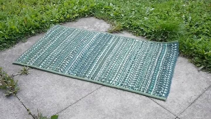 Ковёр получается весьма большим, но и одежды на него потребовалось немало! Вот почему размеры опциональны и могут быть изменены под себя. Главное — освоить технику шитья полос из одежды и самого плетения!