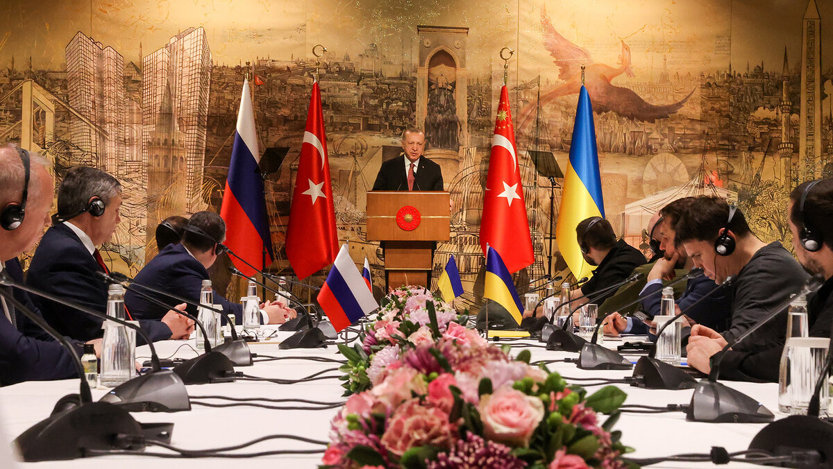 “урци€. —тамбул. ѕрезидент “урции “айип Ёрдоган (в центре) во врем€ российско-украинских переговоров во дворце ƒолмабахче. ƒелегации –оссии и ”краины проведут новый раунд переговоров в очном формате впервые с 7 марта. ѕервый раунд переговоров состо€лс€ 28 феврал€ в √омельской области Ѕелоруссии. ѕозже прошли еще два очных раунда, а также встречи в онлайн-формате. ѕрезидент –оссии ¬ладимир ѕутин 24 феврал€ объ€вил о проведении военной операции на ”краине в ответ на обращение руководителей республик ƒонбасса о помощи. —ергей арпухин/“ј——