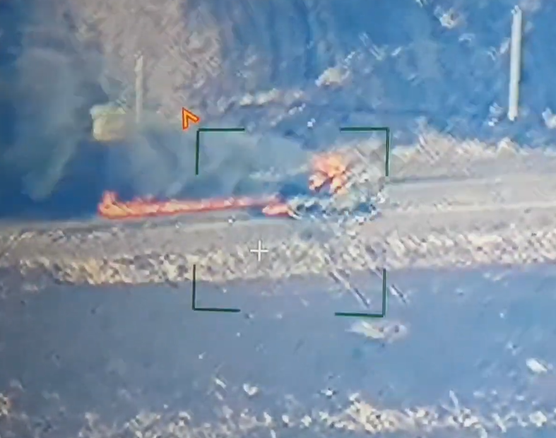Так, в российском сегменте интернета появились кадры объективного контроля, записанные отечественным разведывательным БПЛА, зафиксировавшим, как до боли похожая на американский образец высокоточного управляемого вооружения, горит бронированная гусеничная машина, пораженная чем-то. О том, что всё до крайности серьёзно, свидетельствует разлитое воспламенившиеся топливо. Где был заснят боевой эпизод, а главное – когда, точных данных пока что нет.