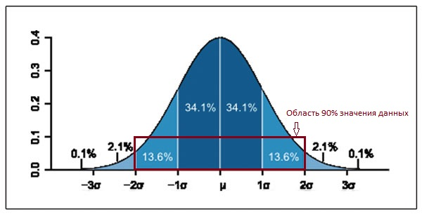 Так вот, на графике Гаусса получится так, что основная масса точек, соответствующих среднему росту человека (90%), попадет в центральную часть “колокола”. Всё, что левее и правее вертикальных линий – те самые аномальные 10% длин роста, которые являются “исключением” из правила.