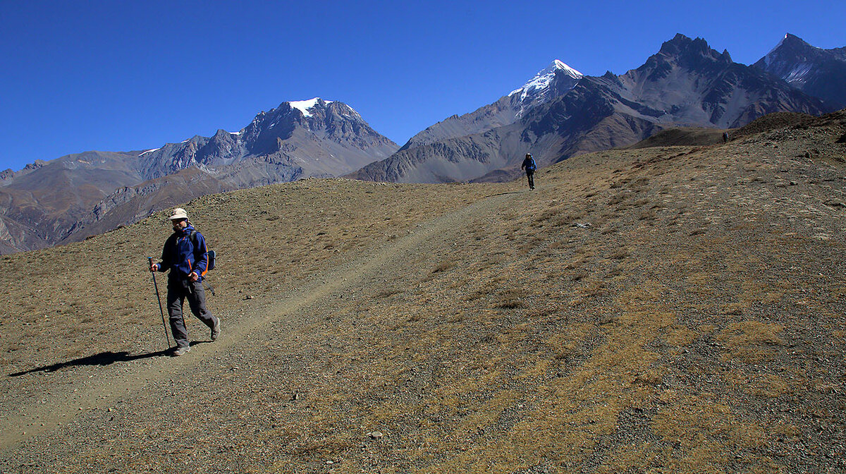 Предыдущий фоторассказ (https://dzen.ru/a/ZeLkS1CtQWrBjsqs ) закончился фотосессией на перевале, за которым последовал спуск в ущелье. С перевала вниз вела хорошо протоптанная тропа. В начале тропы на глаза и соответственно в объектив попалась местная ящерица. На Дхаулагири поднялся ветер и повисли "снежные флаги". Селение Лупра Местный рекламный "баннер" Долина реки Панда Кхола Двое непальцев, мужчина и женщина обустраивали тропу "Баннер" номер 2 Мы путешествовали в сухой сезон, но ширина каньона позволяла представить - какие потоки тут несутся в период муссонных дождей У реки был устроен обед, последний походный обед в данном путешествии В долине реки Кали Гандаки висела пыль. Сергей обещал, что войдя в оную мы получим хороший ветер в лицо с приличным содержанием пыли. И судя по виду впереди, так оно и ожидалось.. Но об этом позже Баннер номер три на входе в селение Лупра. О селении Лупра можно подробнее прочитать вот тут - https://vlade-mir.livejournal.com/252347.html . Судя по фот