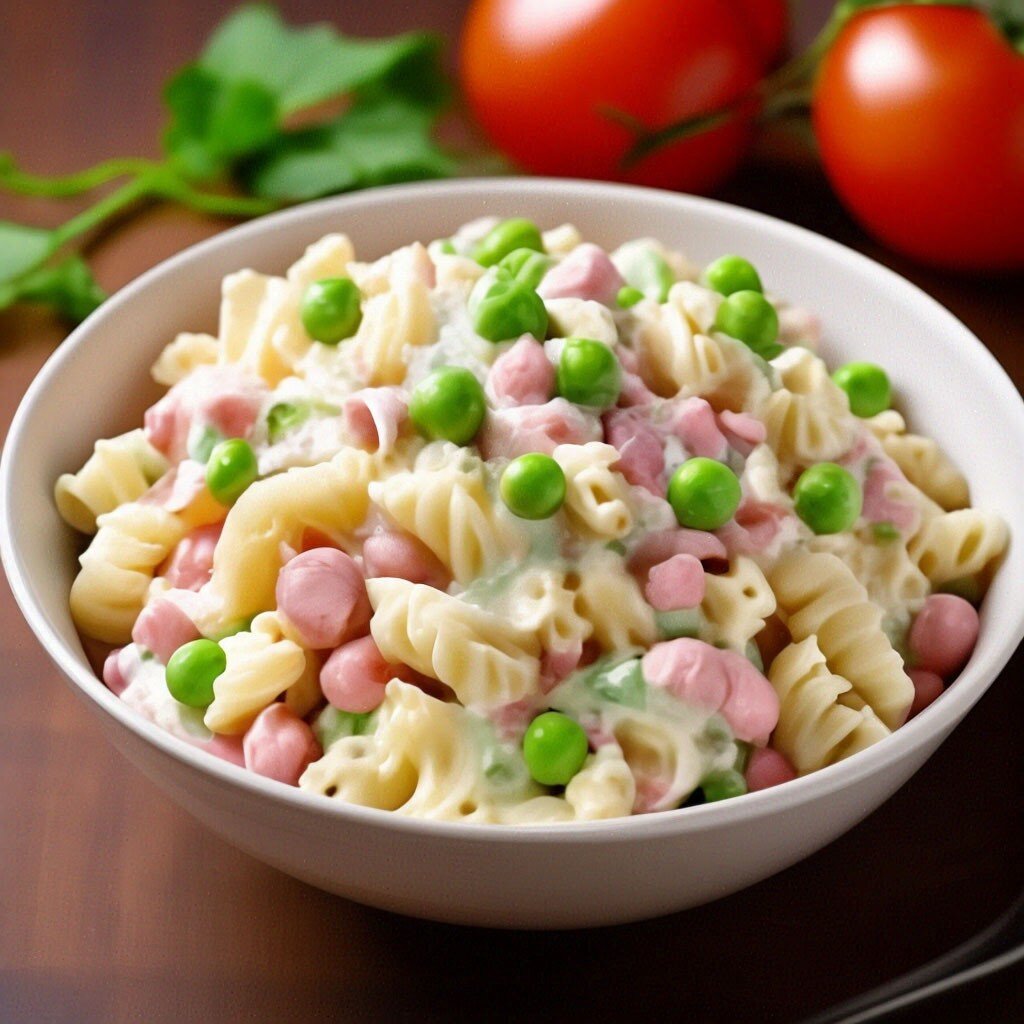 3. В большой миске смешайте макароны, ветчину, горошек и яйца.