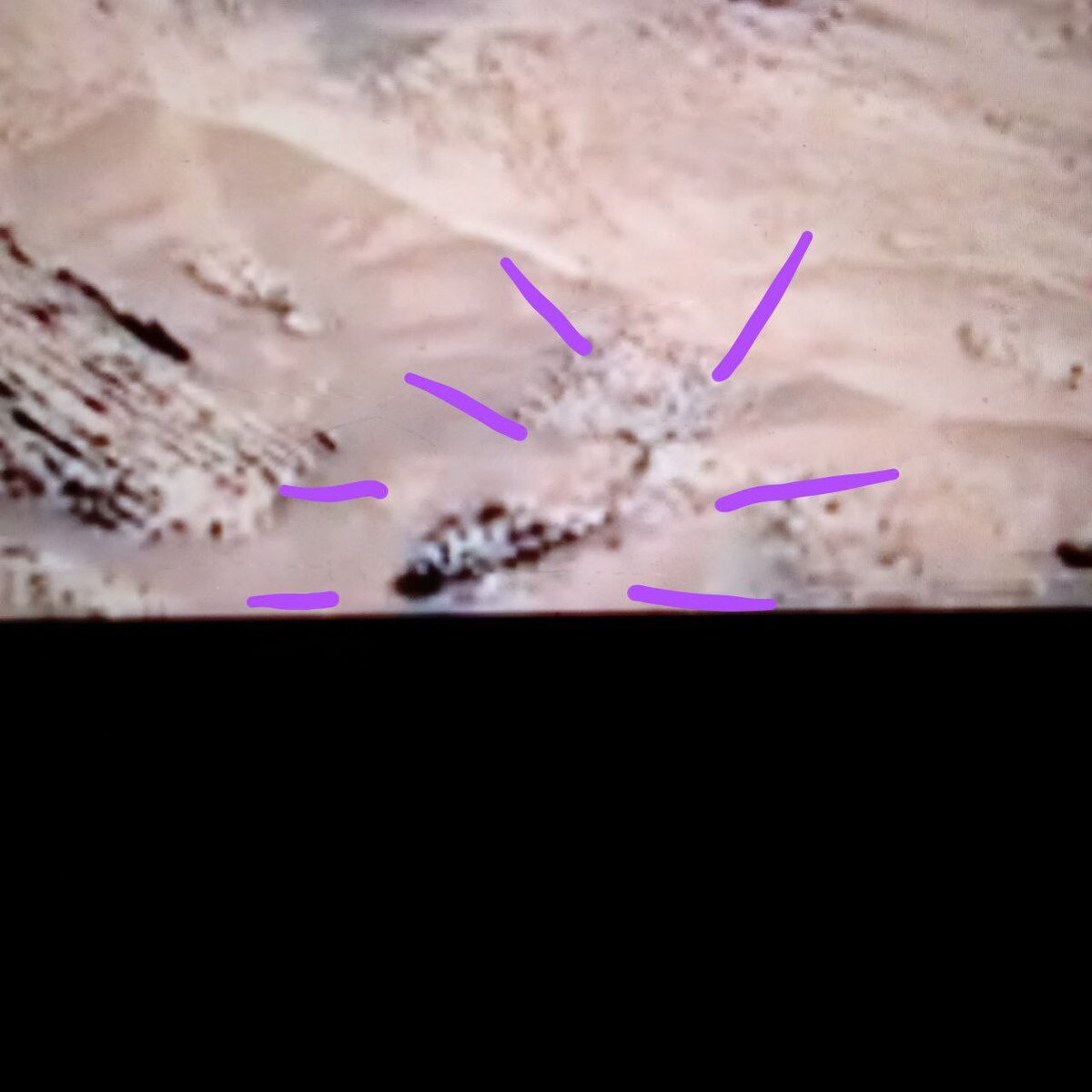 Доброго времени, Дорогие Друзья. Как я и обещал начнем сразу с криворуких специалистов NASA и их работой по сокрытию реального мира на планете Марс. Первые кадры одного из сюжетов были такими и Вы сами можете убедится что в кадр марсохода попала судя по всему Схватка двух огромных существ,слева что то змееподобное,справа огромное членистоногие схожее с Скорпионом,множество ног и хвост поднятый позади существа для смертельного удара! Кадр держится максимум три секунды,потом изображение меняется! Но на этом плане ещё достаточно интереснейших объектов это и черная странная ФИГУРА не соответствующая ни окружающей геологии ни здравому смыслу при внимательном рассмотрении деталей,возможно это скрытый частично спецами NASA огромный и летающий хищник и слева стоит странная Стелла с очевидными геометрическими не природными ФОРМАМИ! Обратите внимание на Черного и его верхнюю часть между Крыльями,просматривается возможная Голова этого хищника! Плохо просматривается на моём фото эта деталь у Черн