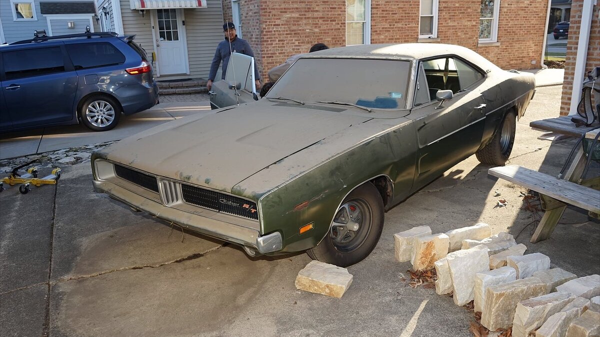 За двадцать лет кузов покрылся толстым слоем пыли, но чистка показала, что на самом деле автомобиль все еще в довольно хорошем состоянии. Если не считать пятен ржавчины вокруг колесных арок и боковых панелей, конечно. Отрадно видеть, как Charger 1969 года выпуска возвращается к жизни после стольких лет простоя. Конечно, этот маслкар еще не готов выехать на дороги, но чистый автомобиль — отличное начало. Этот Dodge Charger был перекрашен, а вот отделка интерьера осталась заводской. Кузов идет с белым верхом, что создает классное сочетание. Изначально у автомобиля была зеленая виниловая крыша. Оригинальная виниловая крыша была снята по неизвестным причинам. Почему так важно, что верх изначально был зеленым? Что ж, интерьер автомобиля тоже зеленый, и этот баланс оттенков был просто идеальным. Сейчас автомобиль не на ходу. Под длинным капотом скрывается V8 объемом 7,2 литра. Выпущен мотор был в 1971 году.