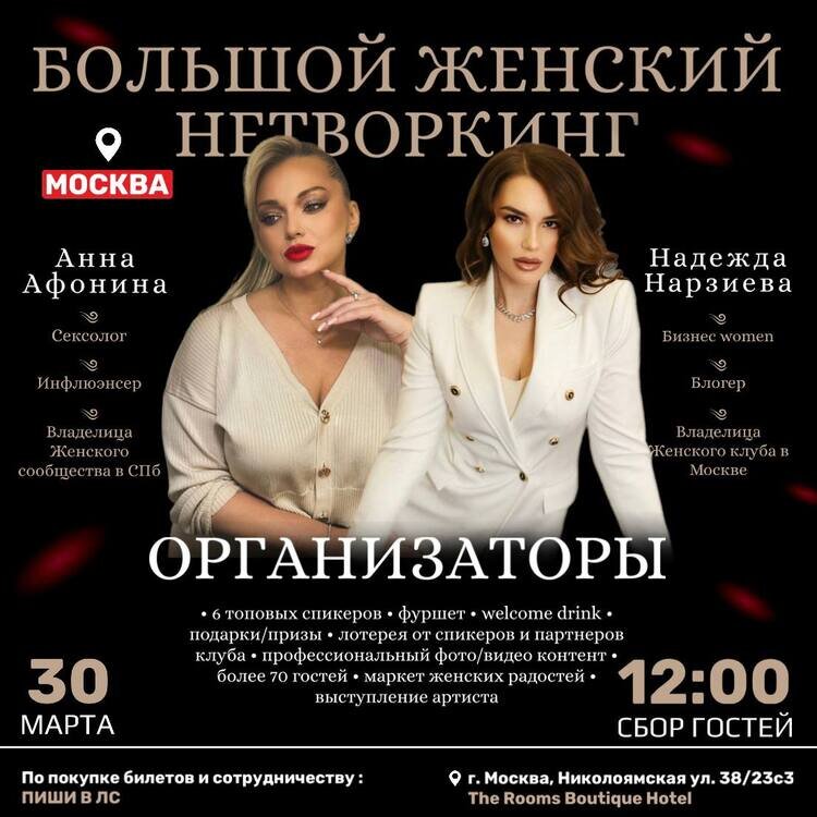 Это уникальное мероприятие, которое подарит не только прекрасный досуг, но и более 70 новых полезных контактов. Дата: 30 марта, 12:00-17:00 The Rooms Boutique Hotel, Москва, Николоямская ул.м 38/23с3 Цена: 6000 руб (при покупке 2-х и более билетов - 5000руб/чел) Что вас ждет: - интересные ресурсные знакомства; - 6 топовых спикеров на актуальные женские темы (сексуальность, финансы, личный бренд, стратегия счастливых отношений, питание и генетика, чувствовать себя, женские практики/духовность); - вкусные угощения и welcome drink; - профессиональный фото/видео контент; - сюрпризы и подарки от партнеров, лотерея с ценными призами; - маркет женских радостей; - праздничное выступление артиста, танцы; - общий тг-чат участников нетворкинга, где можно познакомиться, разместить информацию о себе и своих услугах; - вдохновляющий и красивый досуг; - море позитивных эмоций. Для кого мероприятие: - ты любишь классное окружение и любишь новые знакомства; - ты хочешь рассказать людям о себе, своих ус
