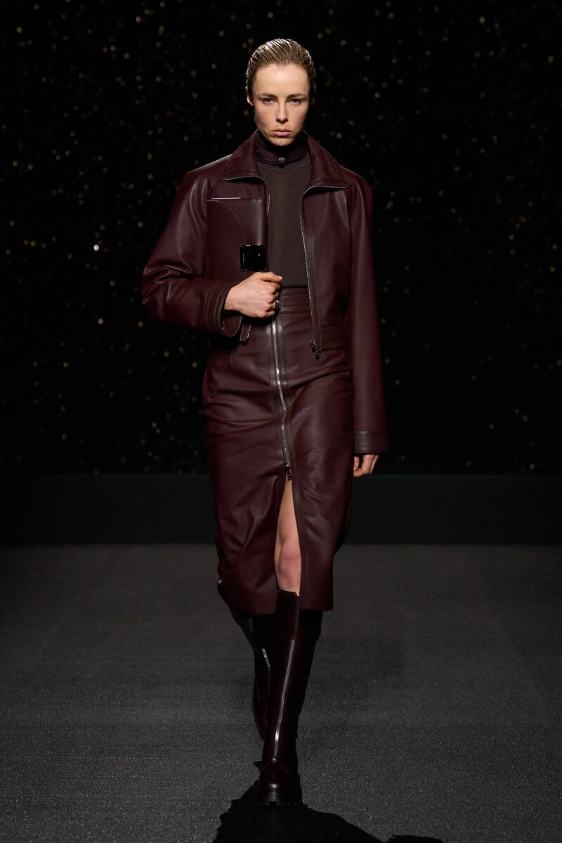 Коллекция посвящена верховой езде и мотоциклам! Но сама креативный директор Надеж Ване-Цыбульски предпочитает велосипед, потому что он безопаснее. Если подиум весенне-летней коллекции напоминал луг: то сегодня его сделали похожим на ночную улицу после дождя: чёрные и скользкие, с металлическими решётками по всей его длине. Потом действительно начался дождь! Цыбульски, которая была директором по дизайну в The Row и работала также в Céline, а также Maison Margiela, представила минималистическую коллекцию с классическими и элегантными предметами одежды, демонстрирующую любовь Дома к коже. Показ открыли монохромные образы в бордовых и красноватых тонах, которые постепенно мутировали в коричневые, бежевые и пастельно-жёлтые цвета, а кульминацией стали абсолютно чёрные образы. Кожа идеально сочеталась с текстурами трикотажа и меха в куртках, пальто, свитерах, брюках и юбках. Здесь мы видим кожаные леггинсы в рубчик и кожаные юбки-карандаш с разрезами сбоку или посередине спереди, одна из кот