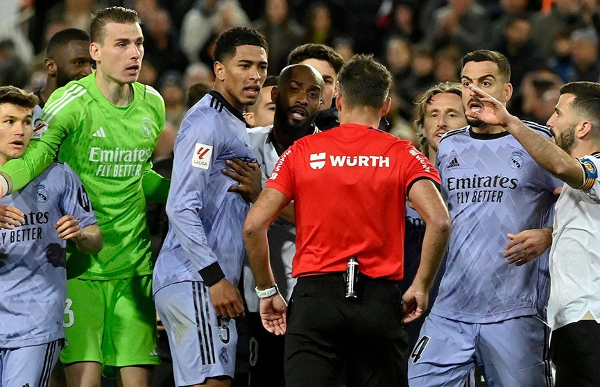 Встреча закончилась ничьей – 2:2 Матч чемпионата Испании по футболу между «Реалом» и «Валенсией» мог бы закончиться победой первой команды, если бы не финальный свисток судьи, который раздался за мгновение до гола. Взятие ворот не засчитали. Встреча, которая проходила в Валенсии, закончилась ничьей – 2:2. В компенсированное время английский полузащитник «Реала» Джуд Беллингем забил гол. Однако за мгновение до того, как мяч пересек линию ворот, раздался финальный свисток арбитра. В итоге гол не засчитали. Футболист начал активно оспаривать решение судьи, за что получил красную карточку. Фото: пресс-служба ФК «Реал»