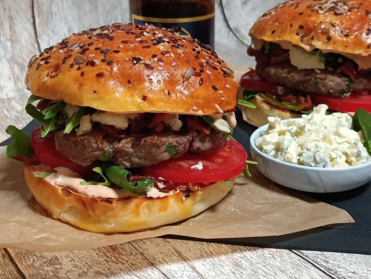 И снова бургер с голубым сыром... (Бургеры с голубым сыром, Бургеры с голубым сыром и панчеттой (Premium), Бургеры с голубым сыром и засахаренными орехами, Бургеры с голубым сыром, двумя видами соусов и луковыми кольцами ) и беконным джемом (Беконно-луковый джем), но в этот раз не будем делать из сыра начинку для котлет, а просто вмешаем в фарш вместе с зеленым луком, а в джем добавим томаты и свежий эспрессо. Подадим на воздушных, мягких булочках с соусом "yum yum", сладкими помидорами, шпинатом и голубым сыром. японские молочные булочки - 3 шт.