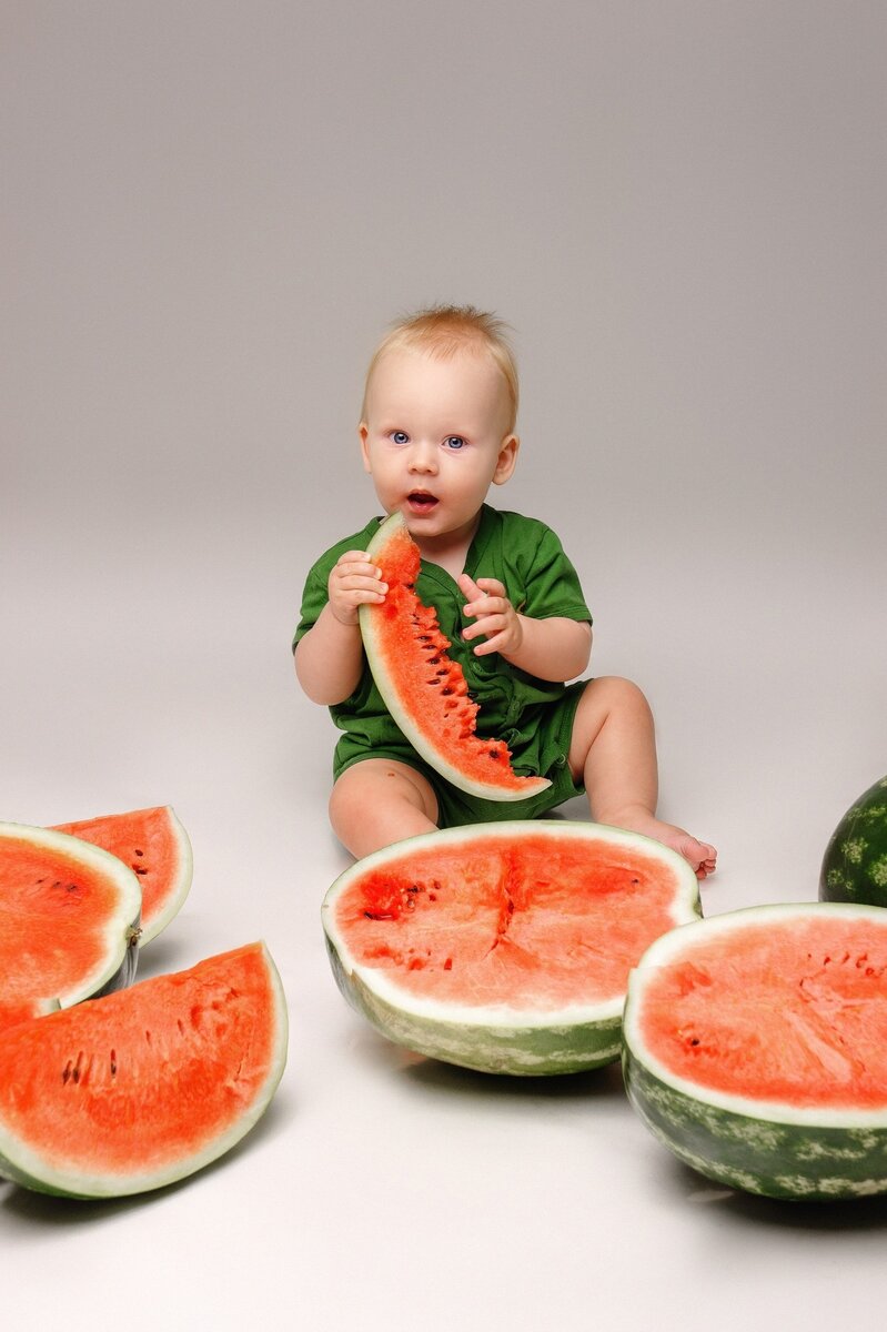 Многим мамочкам идея с поеданием арбуза нравится гораздо больше, чем крушение тортика, фотозону можно дополнить шарами и цифрой на любой вкус и любой возраст.