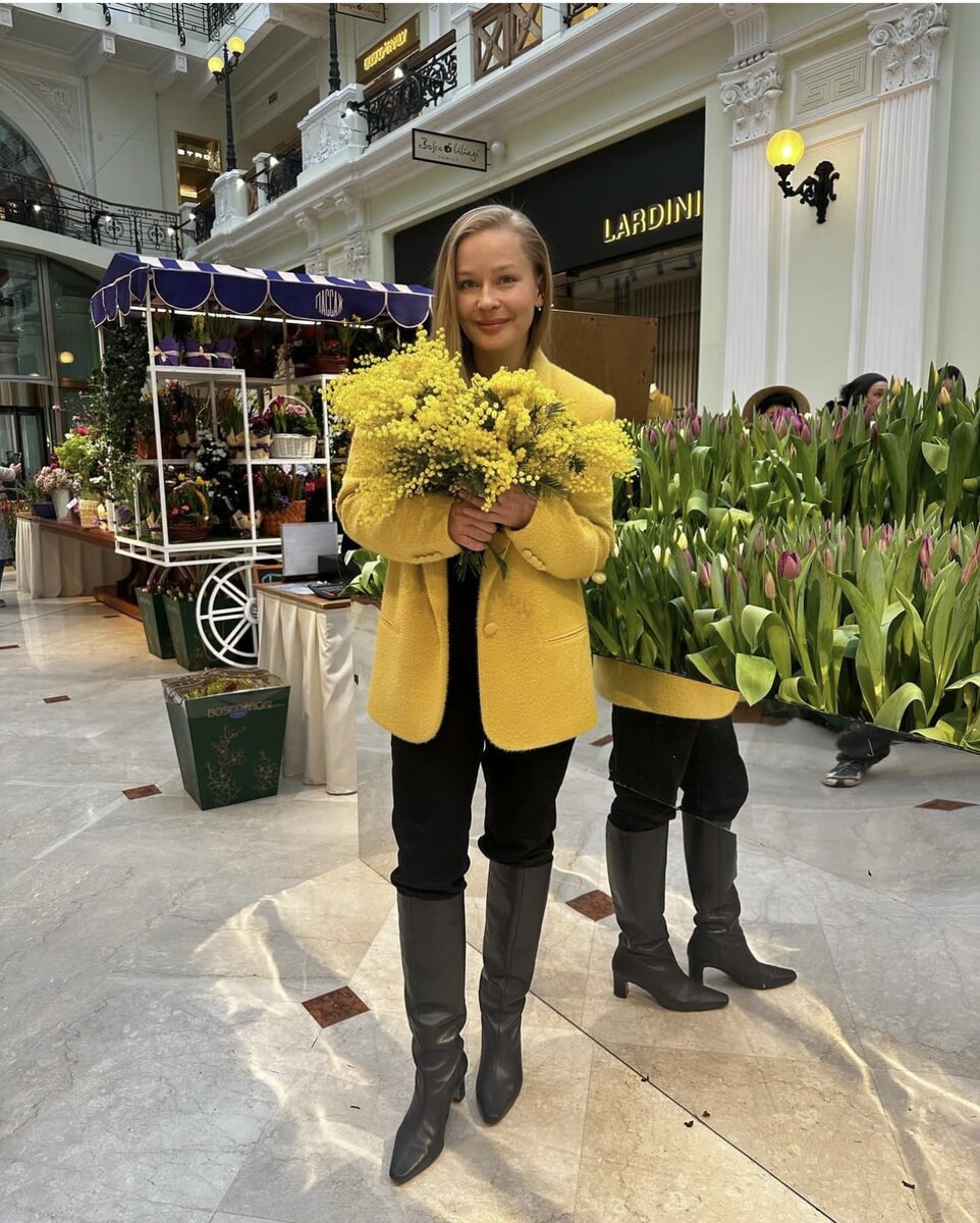 Актриса примерила на себя весну в прямом смысле: солнечно-желтый буклированный жакет, высокие сапоги и мимоза - образ, который заразил меня весенним настроением. А вас?