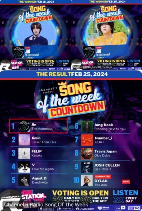 Первый сольный сингл Джина из BTS «The Astronaut» недавно занял первое место в «Песне недели Channel R» на канале Channel R Radio в США. Выигрывал несколько недель подряд.