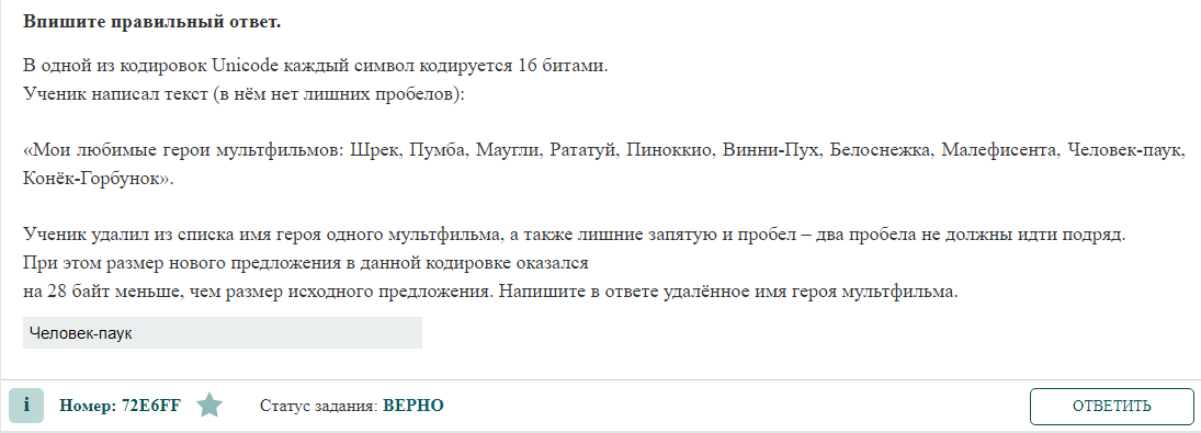 В одной из кодировок Unicode каждый символ кодируется 16 битами. Ученик написал текст (в нём нет лишних пробелов): «Мои любимые герои мультфильмов: Шрек, Пумба, Маугли, Рататуй, Пиноккио, Винни-Пух, Белоснежка, Малефисента, Человек-паук, Конёк-Горбунок». Ученик удалил из списка имя героя одного мультфильма, а также лишние запятую и пробел – два пробела не должны идти подряд. При этом размер нового предложения в данной кодировке оказался на 28 байт меньше, чем размер исходного предложения. Напишите в ответе удалённое имя героя мультфильма. ЧТО НУЖНО ЗАПОМНИТЬ? Перевод байт в биты: 1 байт = 8 бит ЧТО МЫ ИМЕЕМ? Кодировка, где каждый символ копируется 16 битами Исходный текст , размером Х байт Текст , в котором удалили N символов и он стал весить на 28 байт меньше РЕШЕНИЕ Так как в исходном тексте каждый символ кодируется в битах, для того что бы узнать сколько же символов удалили надо перевести 28 байт в биты: 28 байт = 28 бит × 8 = 224 бит Соответственно удалили символов на 224 бит.