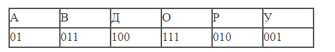 Валя шифрует русские слова, записывая вместо каждой буквы её код. Коды букв даны в таблице. Некоторые кодовые цепочки можно расшифровать несколькими способами. Например, 00101001 может означать не только УРА, но и УАУ. Даны три кодовые цепочки: 11101001 010111011 01001010 Найдите среди них ту, которая имеет только одну расшифровку, и запишите в ответе расшифрованное слово. РЕШЕНИЕ 1) 11101001 Начнем расшифровывать слева направо: 111 - буква О 01 - буква А 001 - буква У 111(О)01(А)001(У) Расшифровываем справа налево: 01 - буква А 010 - буква Р 111 - буква О 11(А)101(Р)001(О) 2) 010111011 Начнем расшифровывать слева направо: 01 - буква А 01 - буква А Дальше расшифровать нельзя, возвращаемся на шаг назад 011 - буква В Дальше расшифровать нельзя, возвращаемся на шаг назад 010 - буква Р, единственный вариант 111 - буква О, других вариантов нет 011 - буква В, других вариантов нет 010(О)111(О)011(В) Цепочка имеет только одну расшифровку РОВ 3) 01001010 Начнем расшифровывать слева направо: 01
