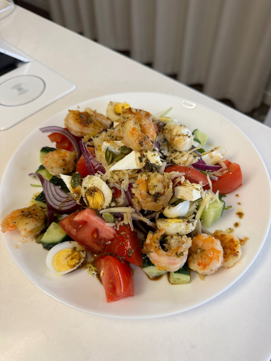 Королевские креветки почистить и обжарить на оливковом масле с лимоном и чесноком, немного посолить и поперчить. Для заправки смешать соевый соус, оливковое масло, лимонный сок, морскую соль, перец и приправу «Прованские травы». На плоскую тарелку выложить нарезанные помидоры, огурцы, лук кольцами, отварные перепелиные яйца, брынзу, можно ещё натереть голландский сыр и добавить тыквенные семечки. Сверху выложить креветки и залить всё заправкой. Очень вкусный салат готов. Не обязательно придерживаться моего состава овощей, можно добавить всё, что любите: руккола, болгарский перец и авокадо тоже хорошо сюда вписываются. Здесь фишка в креветках, их лучше приготовить как в рецепте, тогда получится отлично. Всем приятного аппетита.